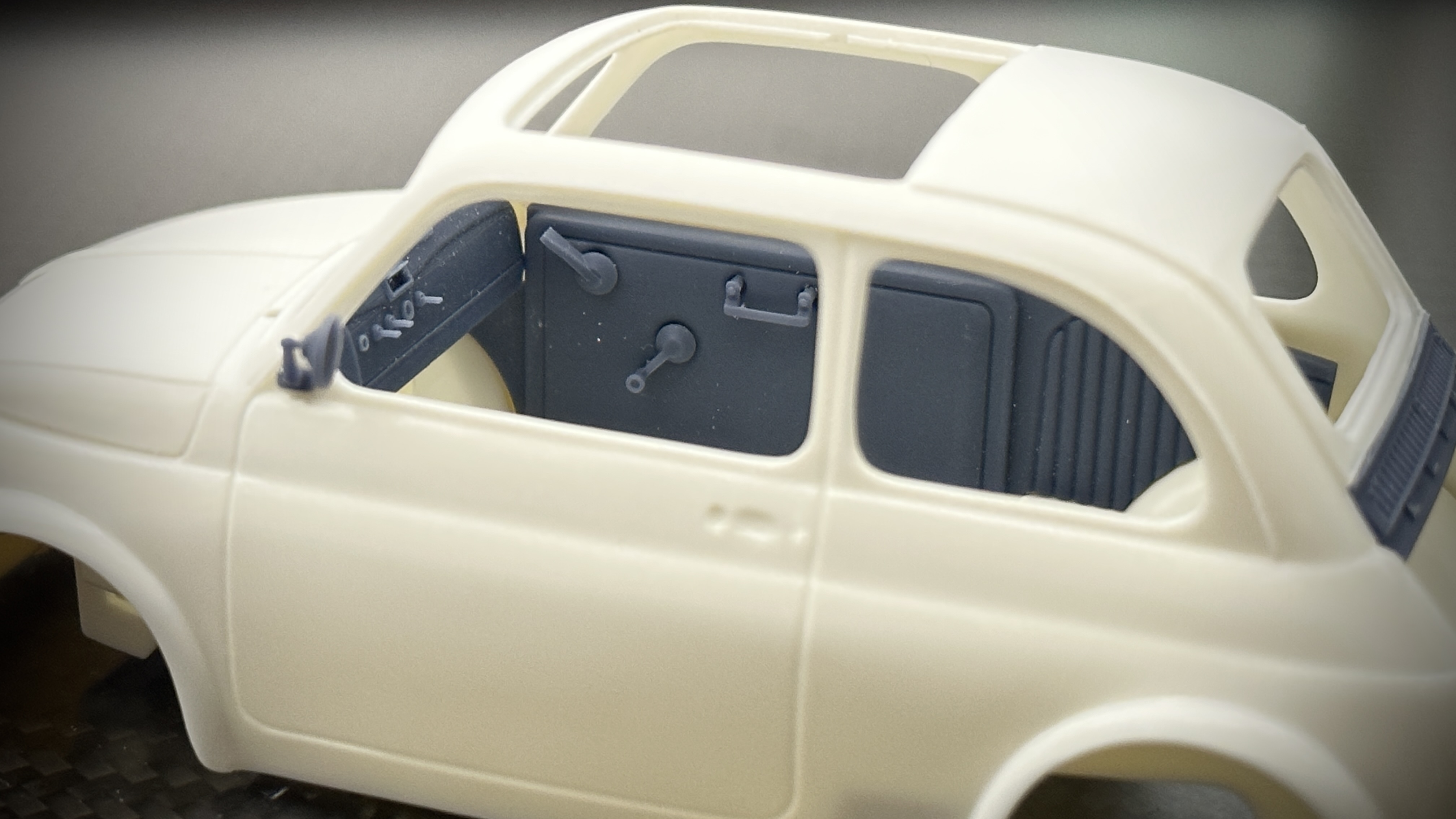 立体感を高めたモールドのドア内貼りは各ハンドル類を別パーツ化で、別体感と塗装のしやすさを両立しています。