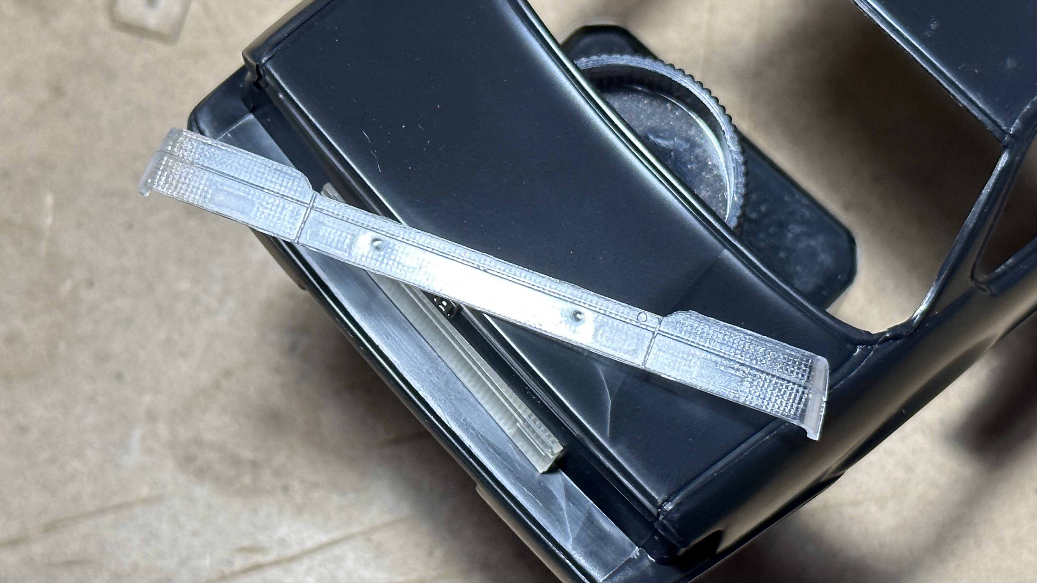 キットパーツでは完成後も目立ってしまう取り付け用のダボ、またそのヒケの修正がクリアパーツな為に困難ですが、このパーツに交換することで解決できます。
